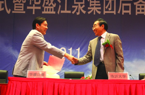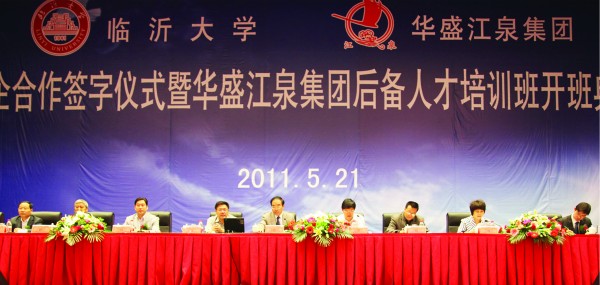 2011年5月21日,臨沂大學(xué)華盛江泉集團(tuán)校企合作簽字暨華盛江泉集團(tuán)后備人才培訓(xùn)班開班盛典在江泉城舉行。出席典禮儀式并在主席臺(tái)就坐的領(lǐng)導(dǎo)有:臨沂大學(xué)校長韓延明博士,臨沂大學(xué)商學(xué)院院長、教授、許汝貞博士,臨沂大學(xué)繼續(xù)教育處處長李殿勇教授,臨沂大學(xué)商學(xué)院培訓(xùn)中心主任、王郡華教授,臨沂大學(xué)商學(xué)院刁玉柱博士,羅莊區(qū)人民政府吳漢林副區(qū)長,沈泉莊黨委于孝燕書記,沈泉莊黨委副書記、華盛江泉集團(tuán)高洪路總經(jīng)理,沈泉莊黨委副書記、華盛江泉集團(tuán)王廷寶副總經(jīng)理,以及臨沂電視臺(tái)、臨沂人民廣播電臺(tái)、臨沂日?qǐng)?bào)社等新聞媒體的記者和集團(tuán)所有高管、各單位管理人員及后備人才等,共800余人出席會(huì)議。
